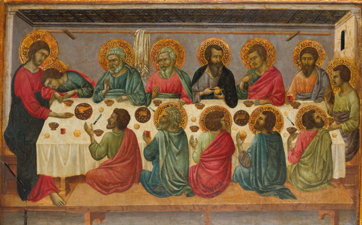 但《最后的晚餐》为了有一起吃饭的感觉,画面的所有人都坐在桌子的一边,全都面向观众。假如坐两边,就有 6 个人背对观众。耶稣说了:必须保证我的正面形象给观众!