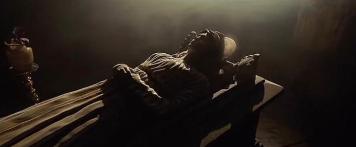 镜头穿过层层迷雾和尘埃,进入黑暗地下室,正中央一个石棺,一束光正好打在棺材上,镜头逐渐拉近,一个女人的雕像,穿着中世纪的衣服。这时候音乐充满了圣洁,达到高潮。