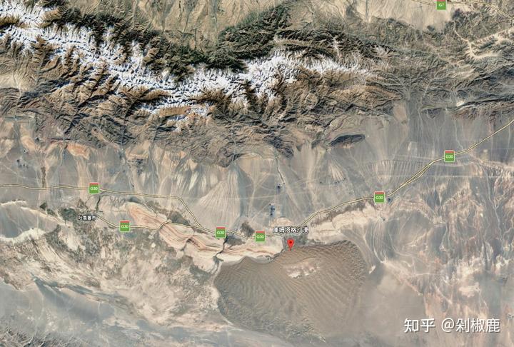 这次新闻里出现的库木塔格沙漠,在地图上放大一点,边上就是雪山: