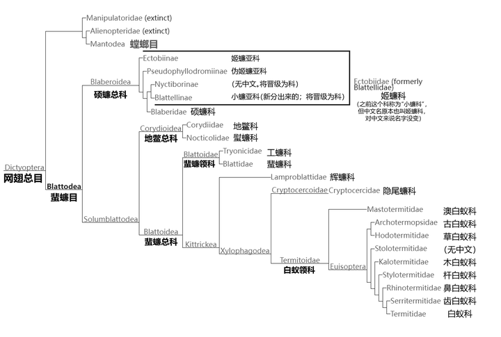 你可以认为白蚁和美洲大蠊的关系比美洲大蠊和德国小蠊(硕蠊总科姬蠊科)的关系都要近的多