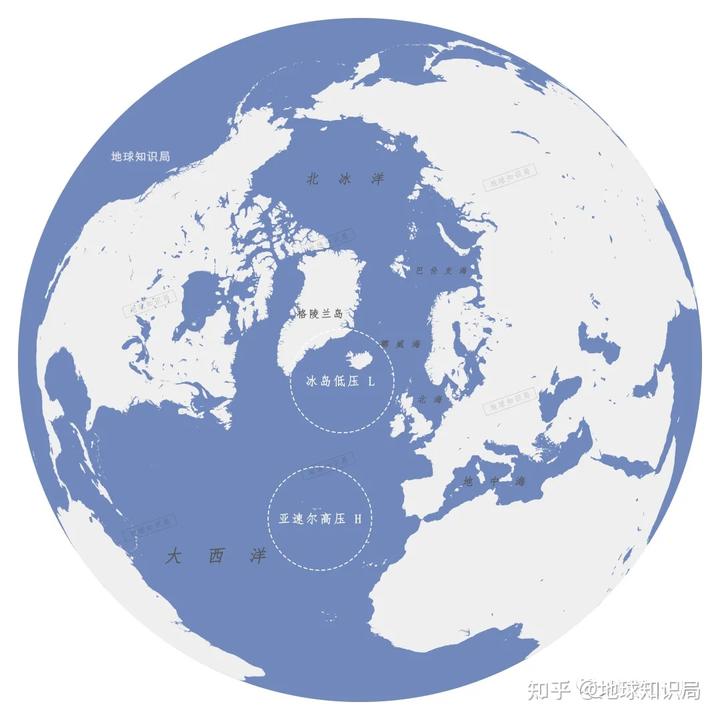 与洋流系统相比,气候系统显然要更加复杂。北大西洋上存在着两个半永久性的大气活动中心,分别为冰岛低压和亚速尔高压。当冰岛低压加深时,亚速尔高压加强;相反,当冰岛低压填塞时,亚速尔高压则减弱。这一类似于跷跷板的现象称为北大西洋涛动(North Atlantic oscillation ,NAO)。