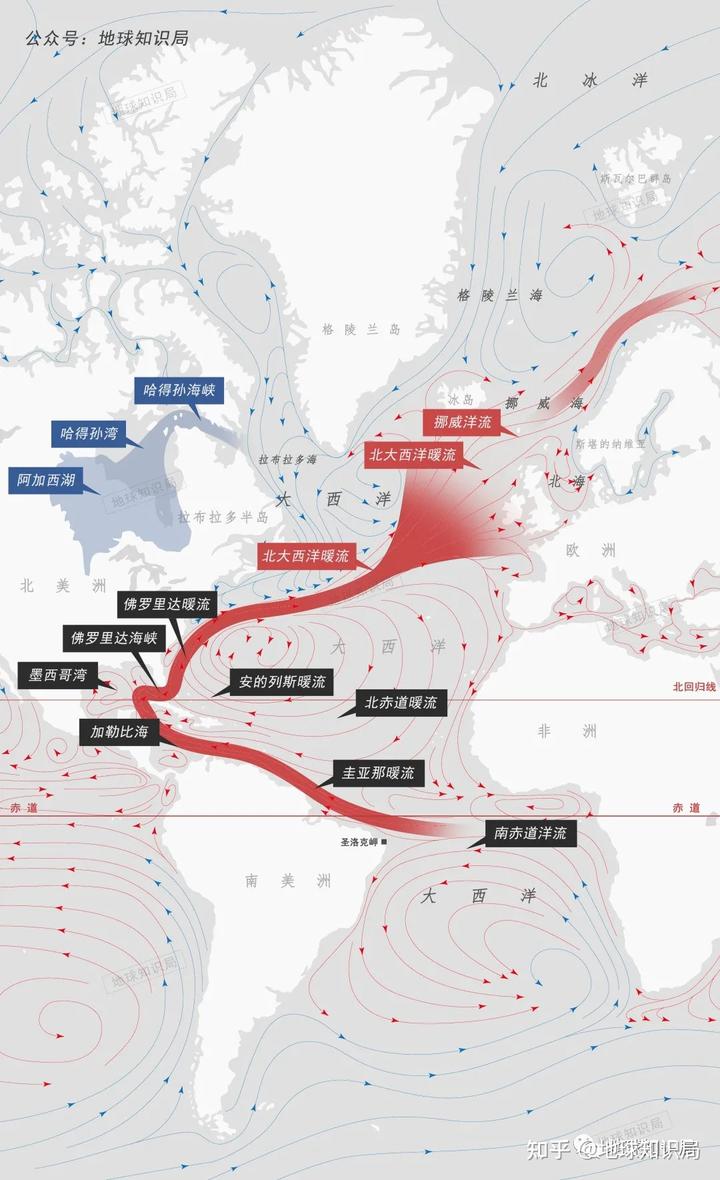 而大部分暖流在中纬度强劲的西风吹拂下沿着与洋流近乎平行的欧洲海岸,经冰岛、英国之间,长驱直入挪威沿岸等高纬度地区,这一支也被称为挪威洋流。