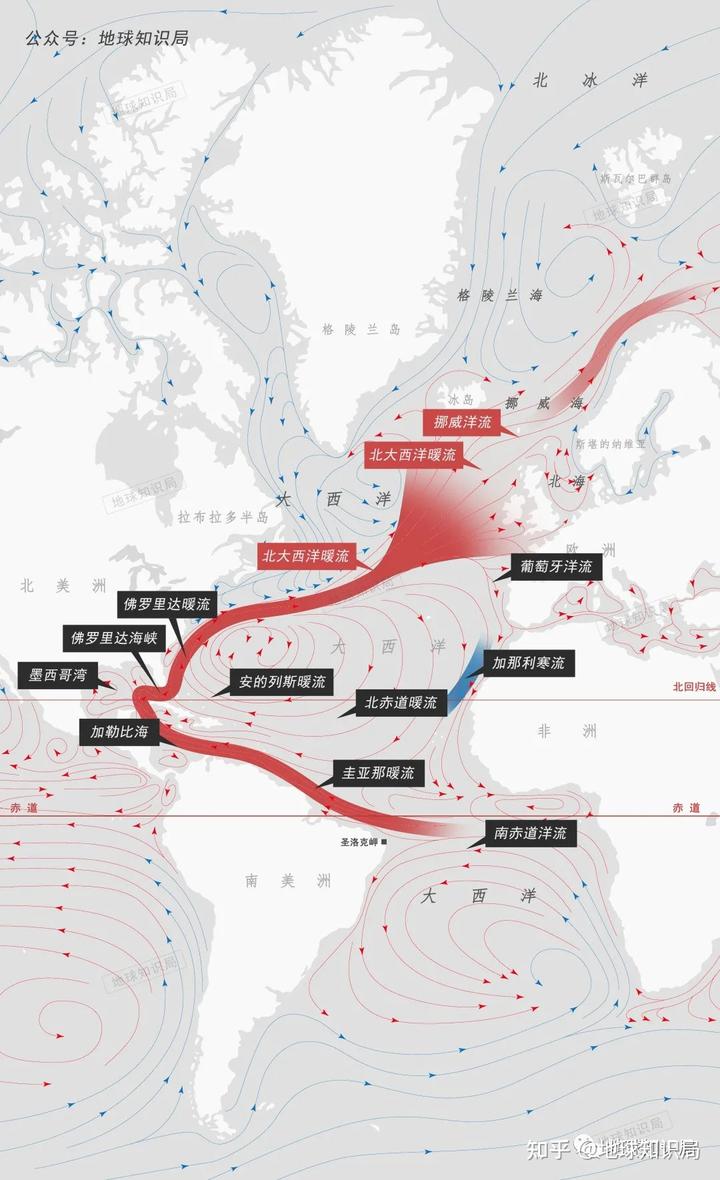 由表层风漂流以及海水温盐环流共同构成的三维环流模式,驱动着北大西洋暖流源源不断地将热量从低纬度向高纬度地区输送,每秒预计向欧洲输送高达1 亿 m³的温暖海水,其产生同等的热量需要近百万座核电站。