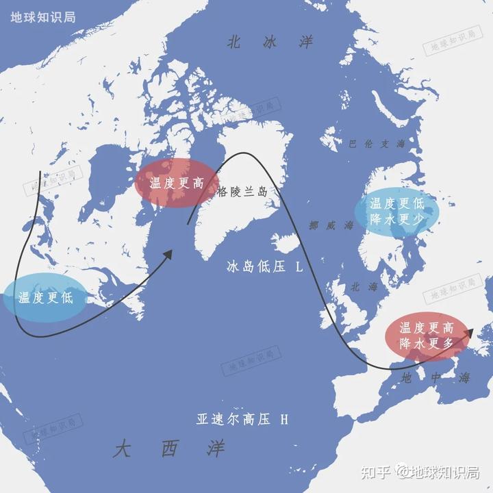 当北大西洋涛动强时,两个活动中心之间的气压差大,北大西洋中纬度的西风强,美国东部和整个北欧的温度和降水高于平均水平,格陵兰岛、南欧的温度和降水低于平均水平。当北大西洋涛动弱时,则观测到相反的温度和降水模式。