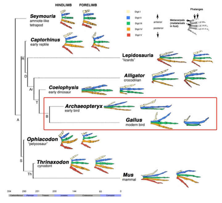 也即鸟类继承了早期兽脚类的 1、2、3 指,但在 Hox 基因表达上发生位移,出现在了 2、3、4 的位置上[10]