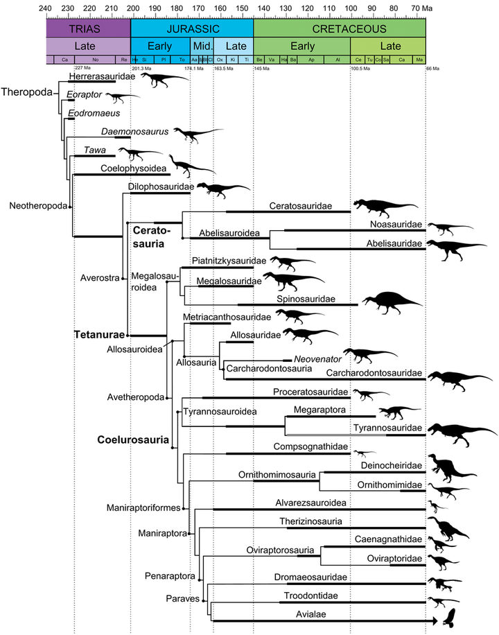 鸟类属于兽脚亚目,这一支恐龙大约 2.3 亿年前就已经出现[7],而且很快发生了前肢的特化。