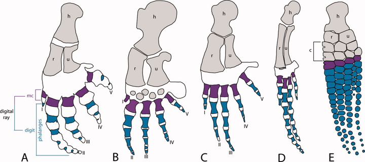 过去 4 亿年,脊椎动物指骨的演化,整体上倾向于由多到少的变化过程[1][2]
