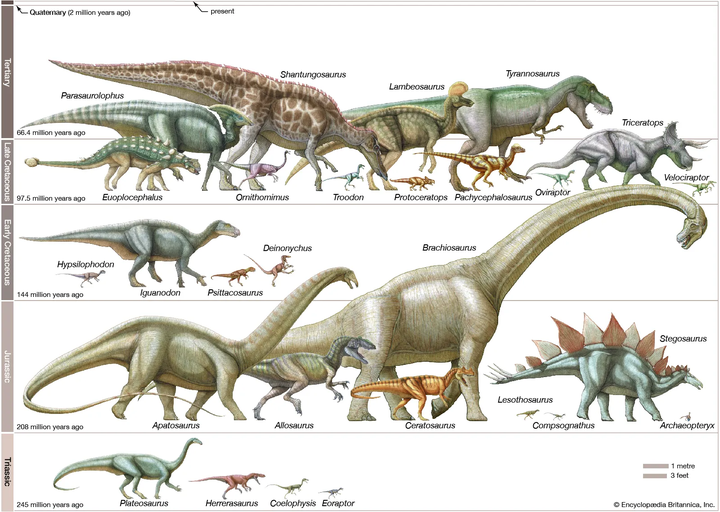 上最大为鸟脚类(山东龙),中最大为蜥脚类(腕龙)