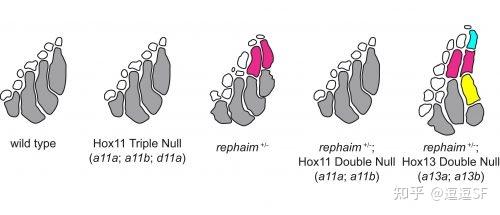 再根据他们之前对 Hox 基因的了解,他们发现在 waslb 基础上再敲除 Hox13 基因,能长出更多的长骨。
