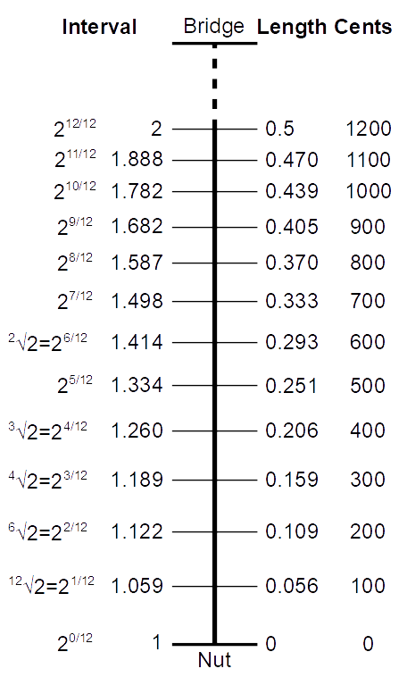 比方说,一个八度的弦长是 x,低一个八度的弦长(绳子长和音高是反比)是 2x,那么 3/2 割弦法的第一个音就选在 3/2x 长度这个位置。