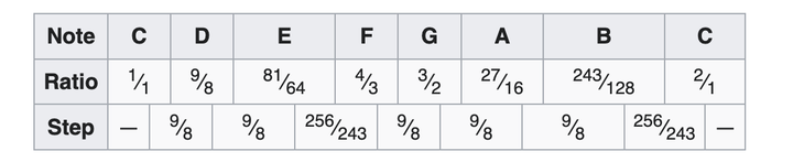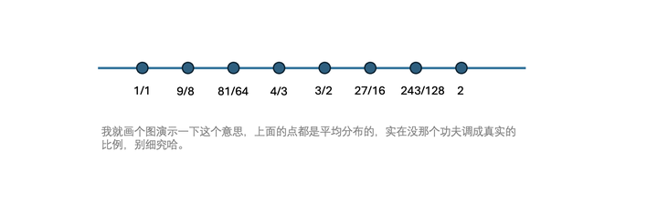 你按着毕达哥拉斯的方法,多折腾几次,完全可以割出 12 个音,其比例和间隔像是这样: