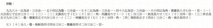 九九八十一以為宮。三分去一,五十四以為徵。三分益一,七十二以為商。三分去一,四十八以為羽。三分益一,六十四以為角。