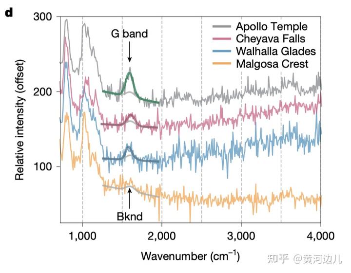 另外,仪器还在这些地方测到有机碳的光谱特征。毅力号在 Bright Angel 的岩石表面用紫外激光照射,检测到了一种光谱指纹——在 1600 cm⁻¹ 的位置有一个清晰的峰值,如下图 G band,这在地球上是有机碳特有的信号。