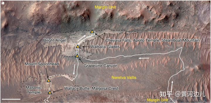 下图中白色线条和箭头表示毅力号在 Neretva Vallis 河道里的行进路径,从南部的 Margin Unit → Bright Angel 露头区 → 再到 Masonic Temple 露头区。橙色三角符号是科学团队重点分析的近距离探测目标。
