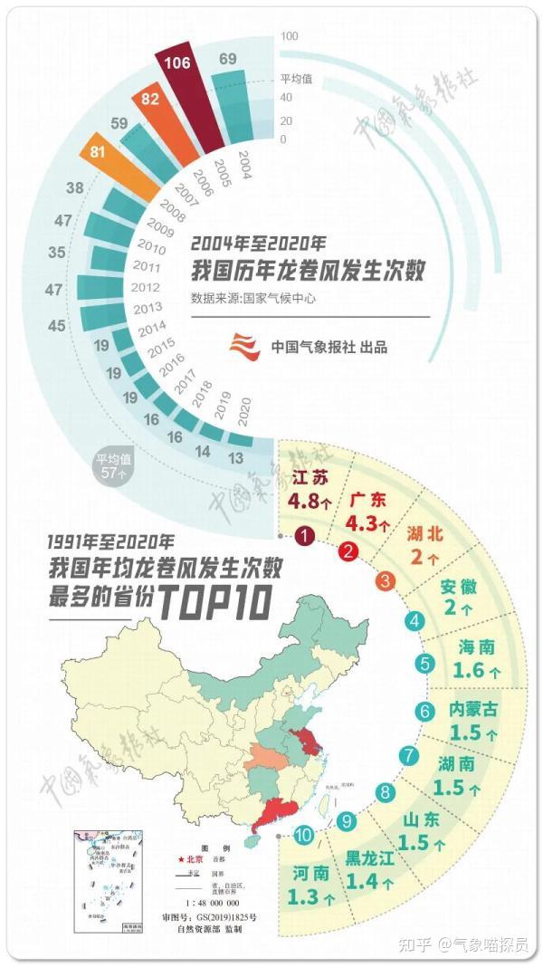 如我国的江苏,它就是我国典型的龙卷风走廊,江苏每年大概会发生 4.8 个龙卷风,取整数大概就是 4~5 个左右,是我国龙卷风发生频率最高的一个省份。主要影响正是我上面所提到的冷暖对撞,因为江苏南不南北不北,是最容易产生激烈冷暖对撞并降下强对流天气的。恰巧江苏又是大规模的平原地区,这位龙卷风的形成并接地提供了一个良好的地理环境,毫不夸张的说从地理角度上来看这就是一个小型的美国中央平原。