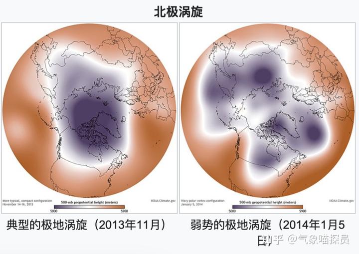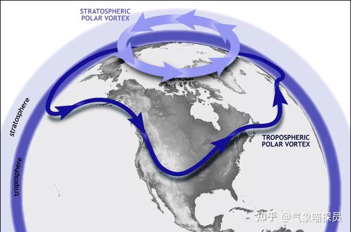 通过上文,大家已经了解到,在整个大趋势中,偶尔的几次变冷时间不能意味着什么。我相信大家又会有一个疑问:为什么这些年寒潮反而变强了?正如开头所说,这就是与极地涡旋有关的。极地涡旋是一个常年存在于地球两极上空规模巨大的低气压冷性涡旋系统。它是一团极其寒冷,密度很高的空气,在自转的地球作用之下,环绕极地做西风方向的旋转。