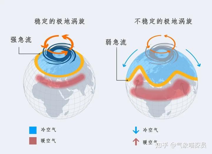 而这个涡旋的强大与否,完全取决于极地地区与中纬度地区的温度差异。温差越大,驱动极地涡旋旋转的西风急流就会越强劲、越笔直。从而像一道牢固的围墙,将核心的极冷空气紧紧锁在北极地区之内。在这种情况之下,中纬度地区冬季虽然会比较冷,但相对温和且稳定,因为此时极地涡旋不会让大量的极地冷空气南下,就像是一所监狱不会让里面的犯人出来作乱。