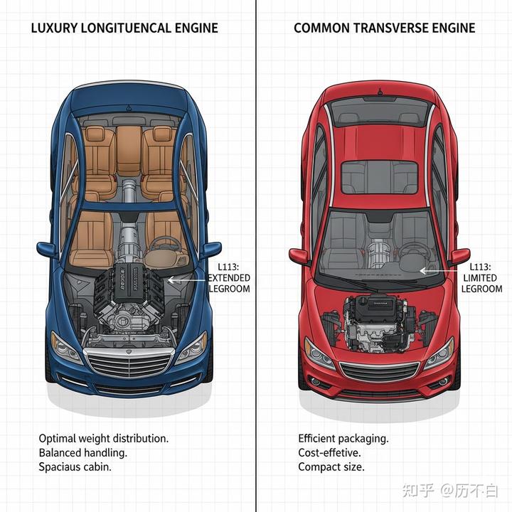 普通前驱车(横置发动机): L113 通常在 300mm-500mm 左右。因为发动机横着放,不需要那么长的机舱。 顶级豪车(纵置发动机): L113 甚至能冲到 700mm 以上。