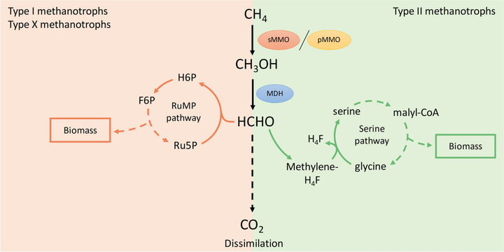 甲烷是一种化学性质极为惰性,且能量密集的气体,要对其有效代谢,需要专门的甲烷单加氧酶(methane monooxygenase)[9]等关键酶系。
