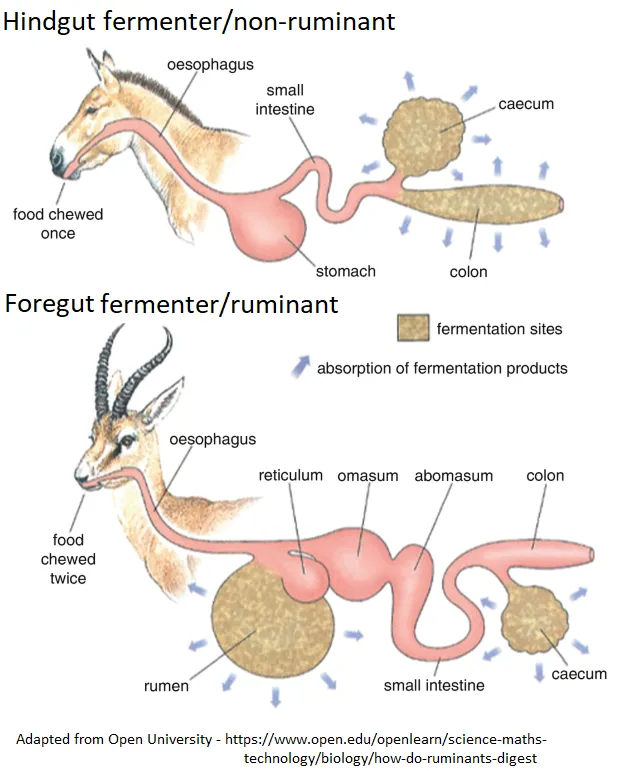 牛羊为前肠消化动物,马驴为后肠消化动物。