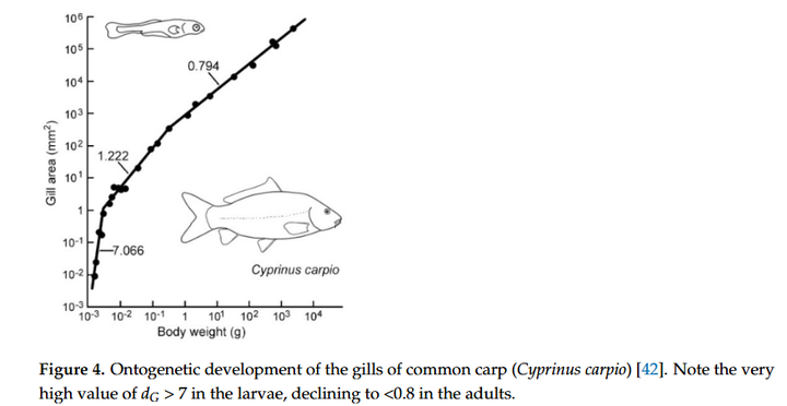 鲤鱼(Cyprinus carpio)鳃的表面积和体重的比例曲线,注意,在幼鱼时期,这个比值>7,非常高,到成鱼时下降至不到 0.8。