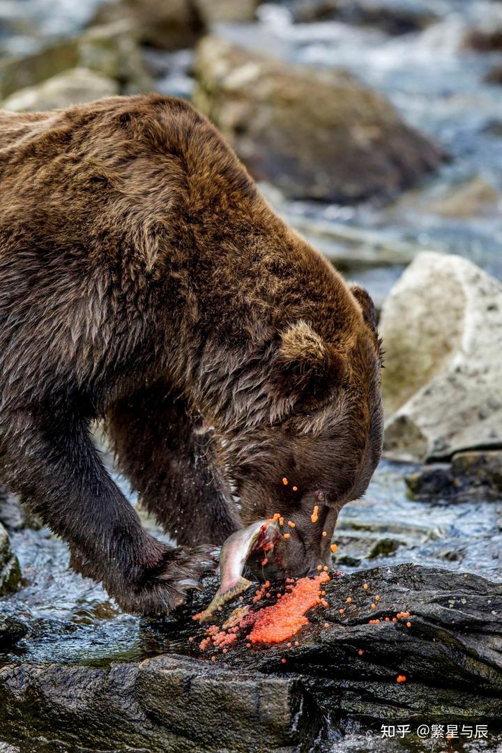 棕熊在鲑鱼洄游季节,为了在冬眠前最大化脂肪储备,它们甚至会只吃鲑鱼的脑髓和鱼籽、鱼腹,也就是最肥美、脂肪含量最高的部分,而把整条剩下的鱼肉扔掉[1]。