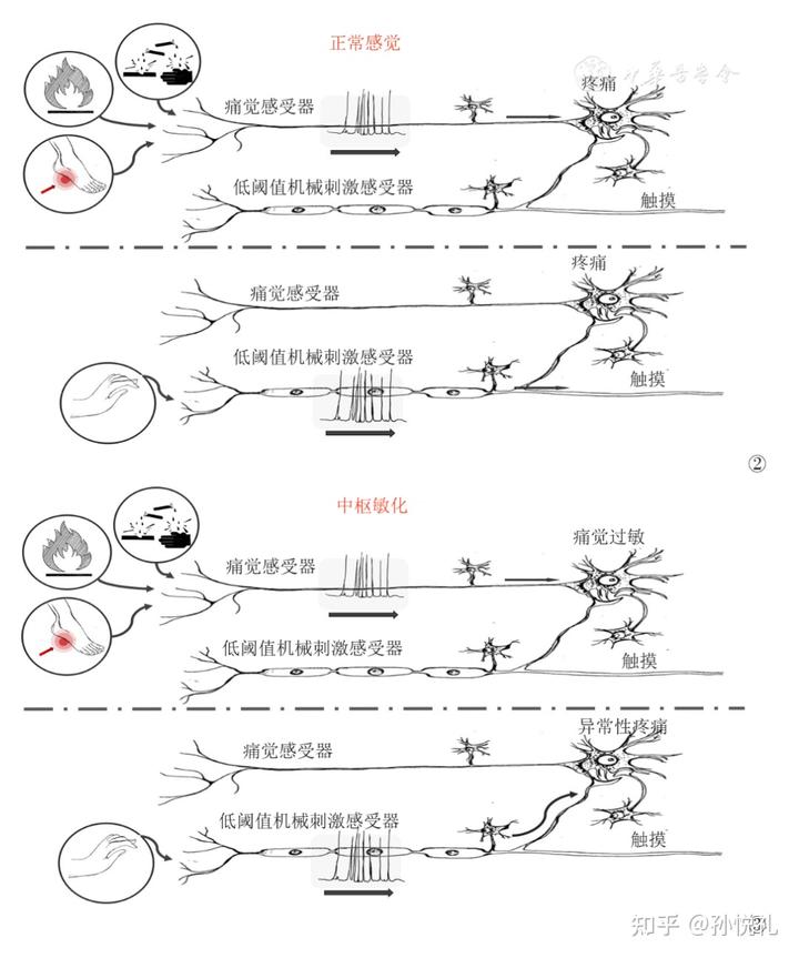 敏化现象: 当疼痛反复出现,大脑与脊髓的神经元会变得更容易被触发,这叫做“中枢敏化”。一些研究表明,这种敏化作用与突触可塑性关系密切,甚至可能导致慢性疼痛。