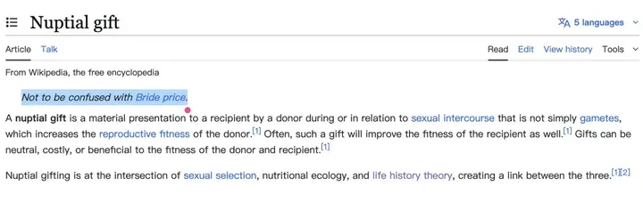 在生物学上,这种行为有一个专门的术语:“婚俗礼物”(Nuptial Gift)。这个词条的维基百科页面,甚至会特意标注“请勿与‘聘礼’(Bride Price)混淆” 。