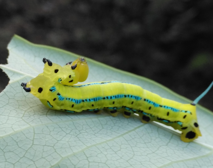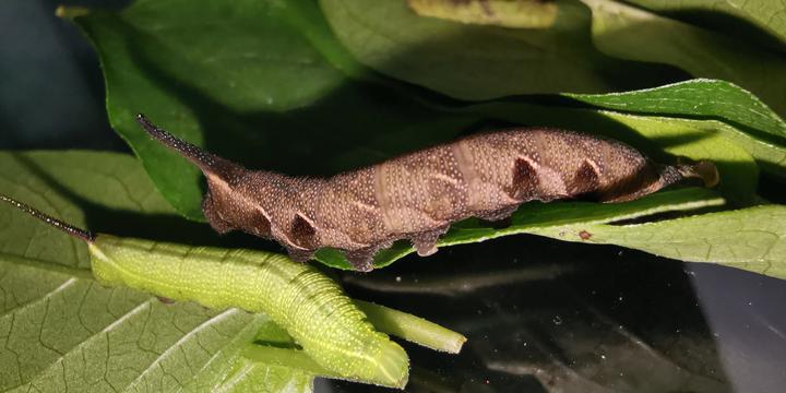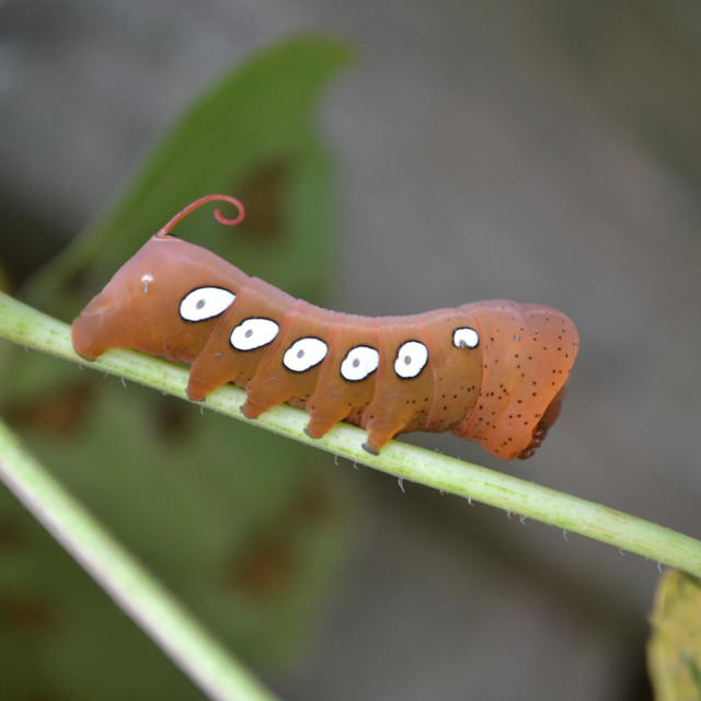 虽然不常见,一些天蛾幼虫在末龄时,尾角会消失,比如北美的 Eumorpha pandorus