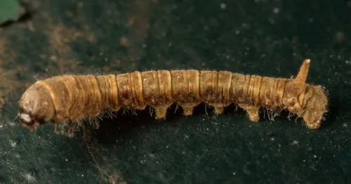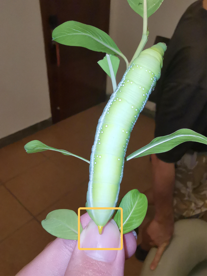 如夹竹桃天蛾的末龄幼虫,尾角变成一个很短的黄色勾勾