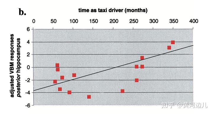 这篇文章用核磁共振成像发现:出租车司机的后海马(posterior hippocampus)灰质体积显著高于对照组,而这后海马这部分组织是进化上专门处理空间导航的关键区域,那里有更多的位置细胞(place cells),专门对特定空间位置敏感。而且,根据对样本的统计发现,司机的从业时间与右后海马体积正相关,统计如下图。