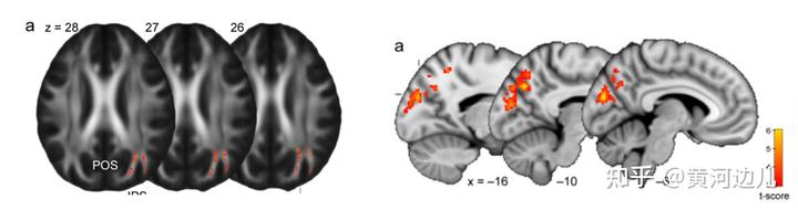 右顶内沟下方白质的分数各向异性显著增加,提示髓鞘化增强或纤维结构更有序。同时,覆盖该区域的枕顶皮层灰质密度也增加。