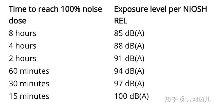 美国国家职业安全与卫生研究院(NIOSH)给出的噪音环境下,用耳的上限值如下图[2],即当声级 L 每增加 3 dB,允许暴露的时间 T 减半。