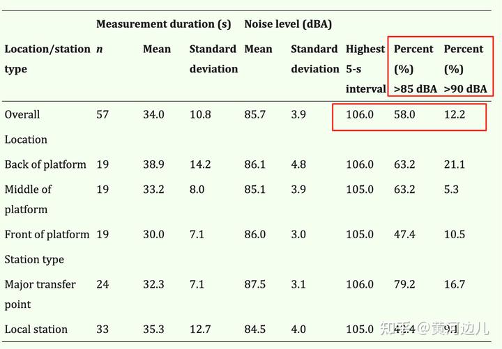 大家主要关注红框里的数字即可,也就是说,地铁站的持续五秒的噪音最高可以达到 106dB,在超过 58%的测量时间里,噪声水平都高于 85 dB;,在超过 12.2%的测量时间里,噪声水平都高于 90 dB。而根据美国国家职业安全与卫生研究院(NIOSH)给出的用耳的上限值,90dB 的噪音,用耳时间建议不超过 2 小时,所以如果每天长时间地铁通勤,长期下来确实会面临听力损伤风险。