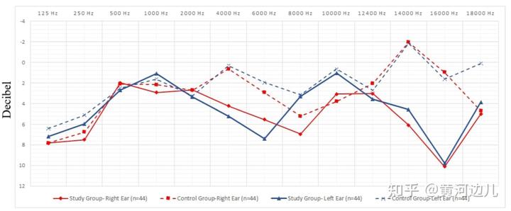 然后看结果吧,用耳机多的研究组(study group,图中实线)在多个高频段的平均听阈显著高于对照组(control group,图中虚线),尤其是 4 kHz,14 kHz、16 kHz 频段,双耳显著变差。