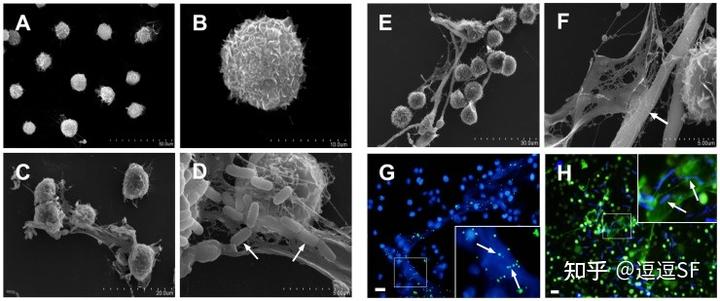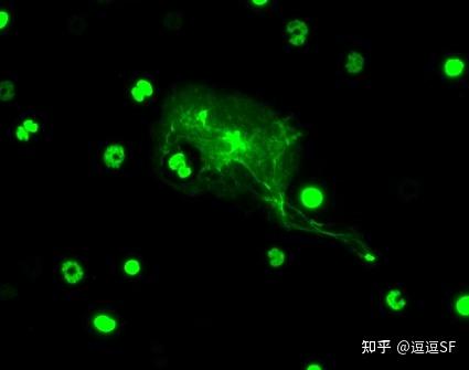 养过中性粒细胞的同学都知道,这玩意儿动不动就被激发,稍微加点免疫激活的东西就喷射,染一下 DAPI(DNA 染料)能看到 DNA 喷得飞起,加点 LPS 或者 PMA 再加点 elastase 的染料,能看到 DNA 飞出细胞十几倍长度那么远。