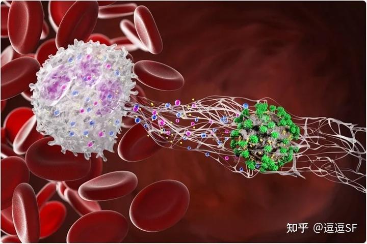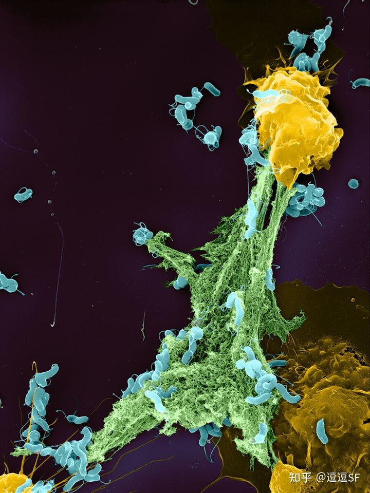 遇到细菌病毒之类的病原体,甚至癌细胞,发现没法吞噬情况紧急,中性粒细胞会立刻化身喷射战士,把自己的 DNA 喷射出去,变成一张“网”,控制住病原体。