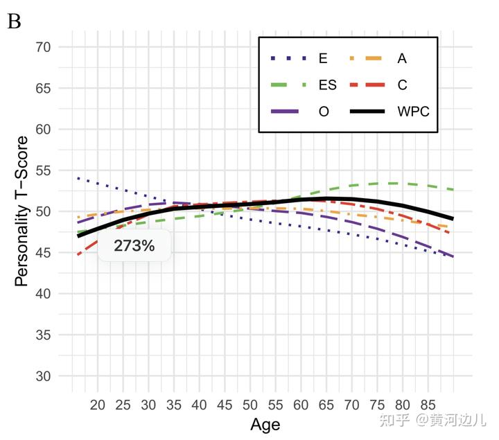 8.亲和性(agreeableness)、下图的橙色点虚线 A,人在中年 40-50 岁最具有亲和性,已经是职场上老油条了,见谁都笑嘻嘻是么...