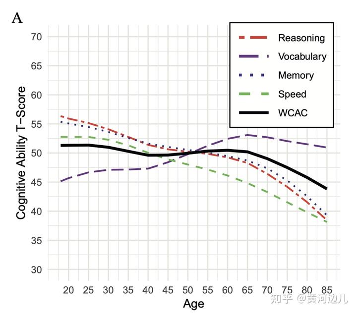 1.大脑的推理能力(reasoning),下图红虚线,这个越年轻越有优势,18–20 岁最高,随后随年龄普遍下降。