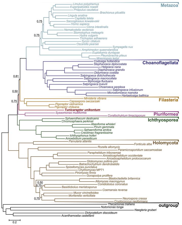 简单来说,所有分子生物学证据都表明,囊掠虫不属于任何已知的后鞭毛生物谱系。它代表了一个极为古老的演化支,在比动物和真菌诞生还要早得多的时候,它就已经与其他所有生物分道扬镳。这样一来,根据支序分类学原则,囊掠虫应该被归类到独属于自己的界中。
