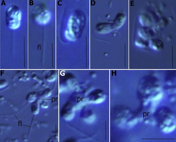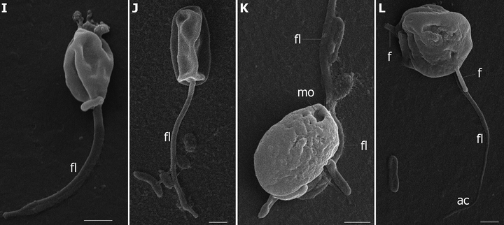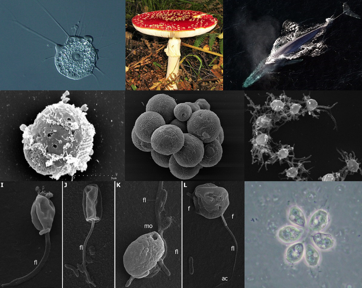 如果你觉得这货长得怎么像个精子,那么恭喜你,你已经初步窥探到了隐藏在其中的奥秘。你之所以会觉得像,是因为囊掠虫只有一根后鞭毛,而这便是后鞭毛生物(Opisthokonta)的最大特征。如果你未曾听说过这个名字,那你只需要知道动物界(Animalia)和真菌界(Fungi)都属于这个类群就行了。显然,囊掠虫的演化位置非同寻常,但即使有了充足的准备,当分析结果出来的那一刻,研究者们还是被震惊到了。