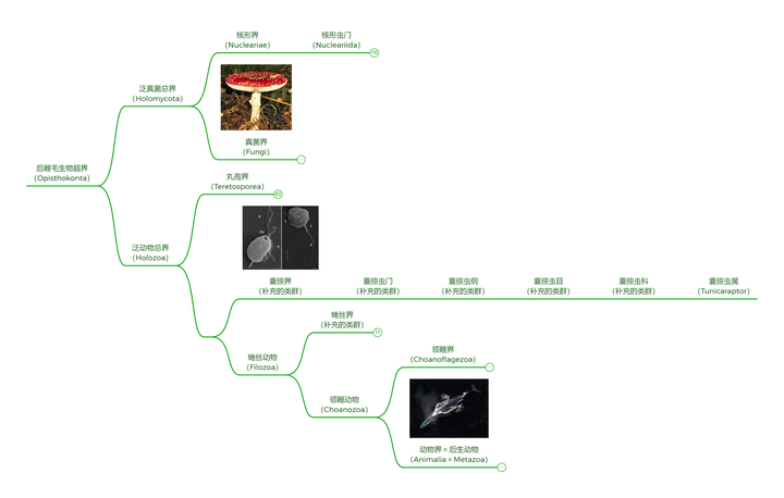 (3)严格来说,囊掠虫只能算是“界级演化支”。顾名思义,这个类群作为一个界还没有被认可的正式名称,但从分支上看,该类群是界级别。事实上,后鞭毛生物中目前仅有真菌界和动物界被正式承认,其他分支严格来说都只能算是界级演化支。