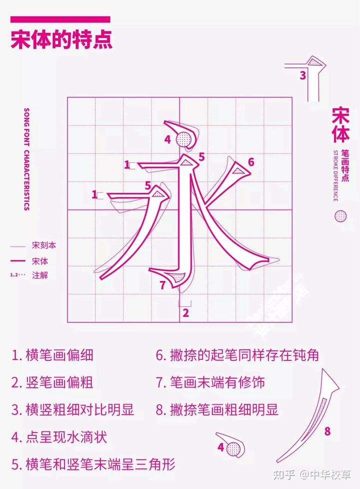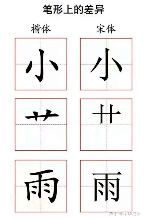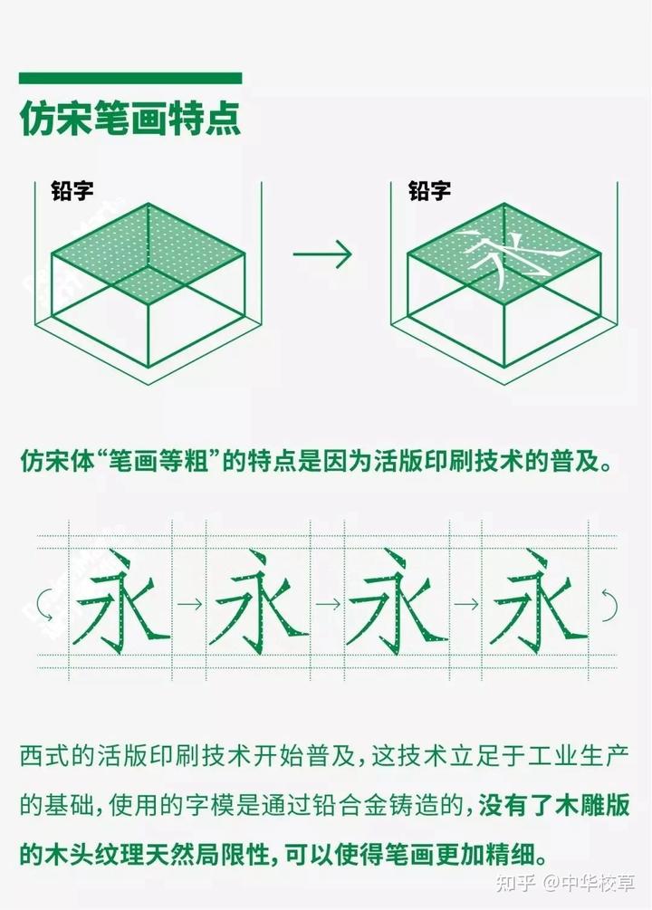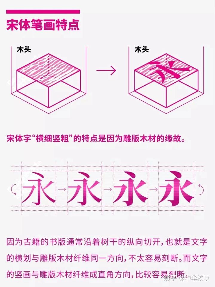 但大部分楷书由于笔画柔软,翻刻起来速度慢、效率低,于是为了适应印刷,就对楷书进行了改进,把偏硬的笔画索性拉直,以加快操作速度。宋体结构严谨、笔画粗细有致,适应了印刷技术的发展和书籍大量复制的需求。