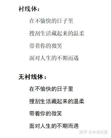 (一)楷体。作为早期字体,笔画接近于手写体,是直接由古代书法发展而来的,字体端正、匀称。楷体在传统作品中运用的非常广,但是楷体是不会作为主标题的文字选择。一般用于小学课本及幼教读物,便于孩子们模仿与模写。在中、小号标题,作者的署名等使用,以示与正文字体相异而突出。但用楷体作标题时,至少要比正文大一个字号,否则标题字会显得比正文还小。