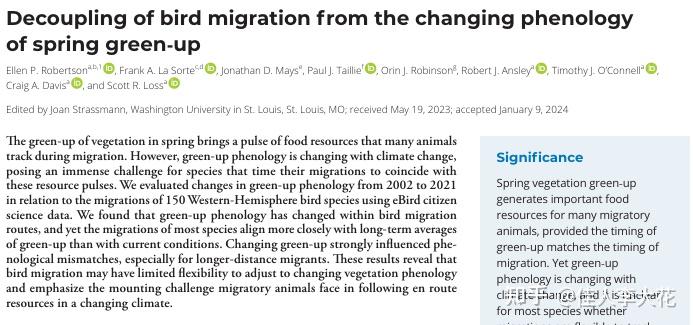 有一篇发表于 2024 年 PNAS 的研究探讨了气候变化背景下鸟类迁徙与春季植被返青现象之间的关系: