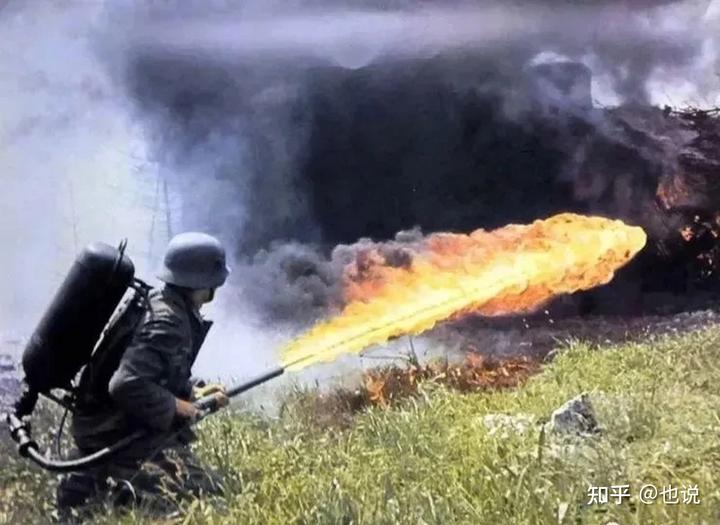德军“清扫突击队”装备 MP40 冲锋枪、火焰喷射器。