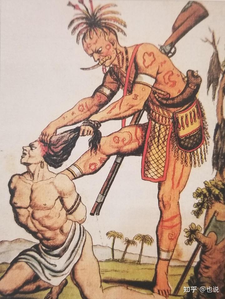 法国 18 世纪的版画,描述了一个易洛魁族勇士割取一名被缚俘虏的头皮。