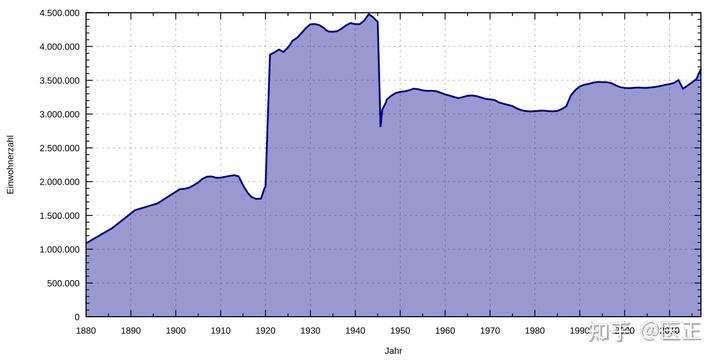 二战后期的破坏及东西德的分裂,也导致柏林人口一蹶不振。柏林人口迅速从最高峰的 450 万下降到 280 万,一直到今天柏林人口都才恢复到百年前的 3/4。