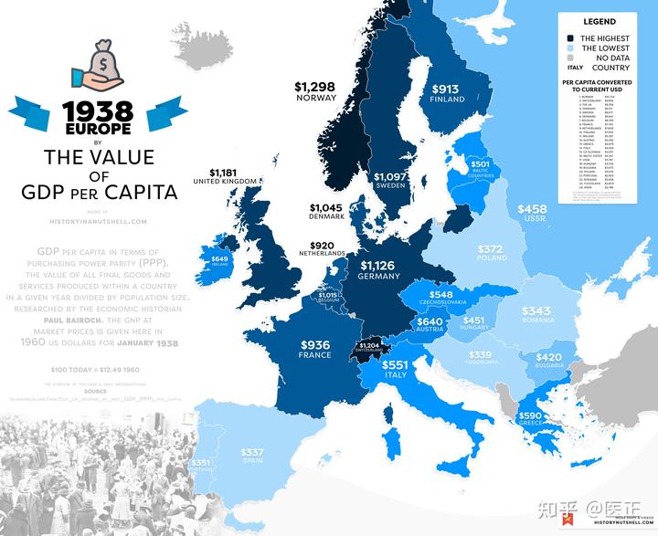 再考察 1938 年时的欧洲人均收入分布地图,可以看出二战前夕德国是欧洲人均最高的国家之一,那么作为其政治、经济、文化乃至教育中心的首都柏林自然而然是世界级的城市。