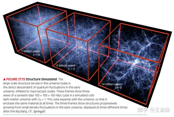 - 每时每刻从真空量子涨落出的东西应该是在宇宙空间中均匀分布的,而暗物质在宇宙中不是均匀分布的。在 100Mpc 的尺度上呈网状结构分布,在星系的尺度上也有暗物质晕的分布。比如下面这张图,模拟了冷暗物质主导宇宙形成网状结构的过程。